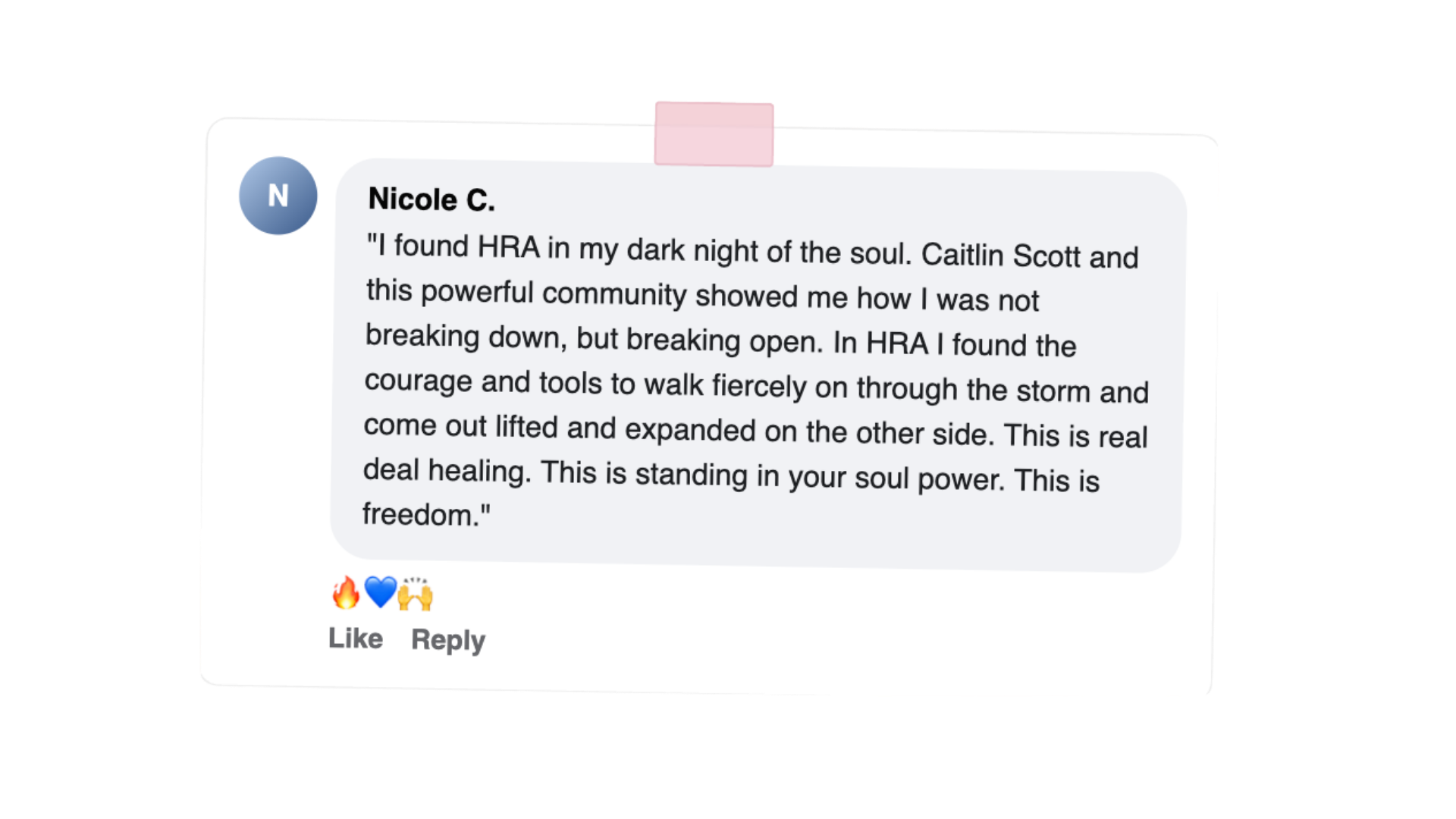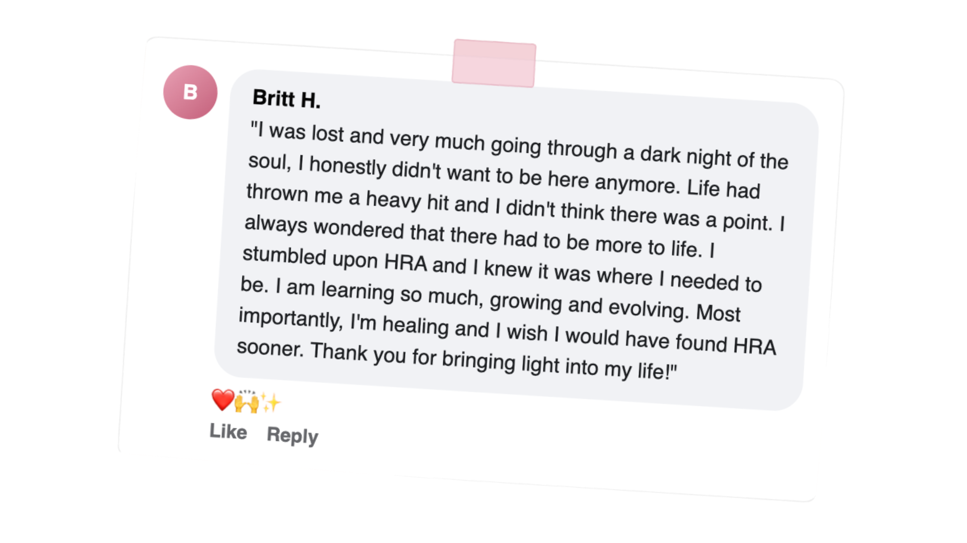 "HRA was the community and resources I didn't know I needed. Prior to finding HRA, I was a hot mess on a daily basis. I had tried so many different therapies, modalities, and coaches without feeling any changes. When I found HRA it was as if I had found my home."